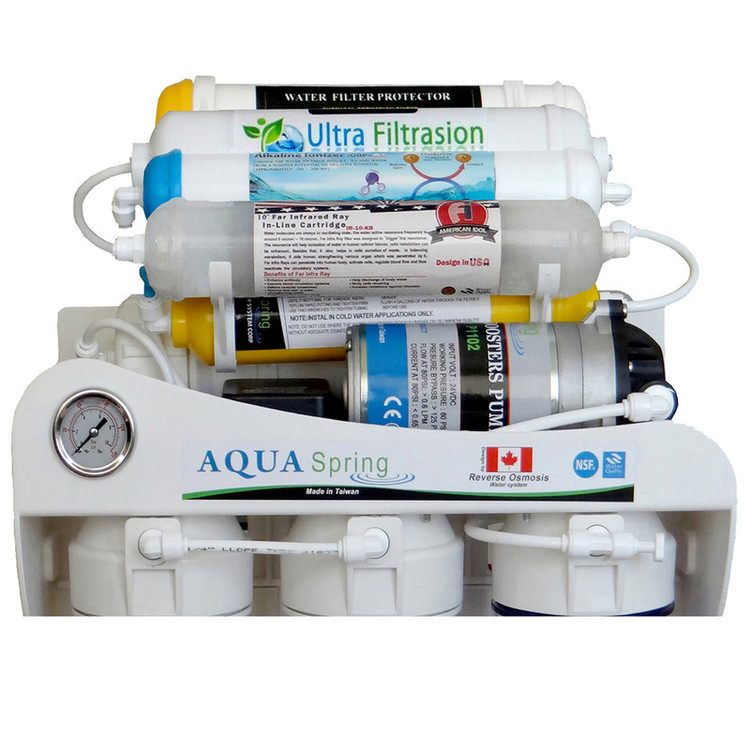 دستگاه تصفیه آب خانگی با برند معتبر اکوآاسپرینگ مجهز به مکانیزم دوگانه مدل UF - SF4800 ده مرحلهای و دارای باکیفیتترین و بروزترین تکنولوژی در فرایند دستگاههای تصفیهآب خانگی است. در این دستگاه از متریال و هوزینگهای فودگرید، فیلترهایی برپایه گیاهی، مخزن آنتیباکتریال 16 لیتری، مگابوستر پمپ قوی بافشار 125 PSI و شیر جداگانه برخوردار است. آب شرب دارای مقادیر زیادی املاح و آلودگی است. این آلودگیها قابل رویت نیستند بلکه فقط با آزمایش تشخیص داده میشوند. بههمین علت اخیرا استفاده از دستگاهای تصفیهآب خانگی در کشورمان بهیک امر ضروری مبدل شده است. چراکه آب آلوده منشاء اصلی اکثر بیماریهاست. عملکرد فیلترهای این دستگاه در سهمرحله اول بهاینصورت است که کلیه املاح معلق و مضر، کلر، آفتکشها و شوری را از آب گرفته و درمرحله بعد نیترات، نیتریت، جیوه و میکروارگانیسمهای شیمیایی و فلزات سنگین (کلیه املاح سرطان زا) را بهطور کامل از آب میگیرد. سیستم اولترافیلتراسیون تکنولوژی جداسازی ذرات معلق تا 0/01 میکرون با غشاهای میان تهی از جنس پلی پروپلین بر پایه گیاهی گفته میشود. دستگاه فوق دارای فیلتر اکسیژن ساز است که به وسیله سنگهای بیوسرامیک و شکست مولکولی آب سطح میزان اکسیژن آب را افزایش میدهد.