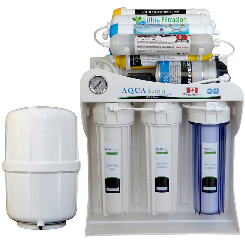 دستگاه تصفیه آب خانگی با برند معتبر اکوآاسپرینگ مجهز به مکانیزم دوگانه مدل UF - SF4800 ده مرحلهای و دارای باکیفیتترین و بروزترین تکنولوژی در فرایند دستگاههای تصفیهآب خانگی است. در این دستگاه از متریال و هوزینگهای فودگرید، فیلترهایی برپایه گیاهی، مخزن آنتیباکتریال 16 لیتری، مگابوستر پمپ قوی بافشار 125 PSI و شیر جداگانه برخوردار است. آب شرب دارای مقادیر زیادی املاح و آلودگی است. این آلودگیها قابل رویت نیستند بلکه فقط با آزمایش تشخیص داده میشوند. بههمین علت اخیرا استفاده از دستگاهای تصفیهآب خانگی در کشورمان بهیک امر ضروری مبدل شده است. چراکه آب آلوده منشاء اصلی اکثر بیماریهاست. عملکرد فیلترهای این دستگاه در سهمرحله اول بهاینصورت است که کلیه املاح معلق و مضر، کلر، آفتکشها و شوری را از آب گرفته و درمرحله بعد نیترات، نیتریت، جیوه و میکروارگانیسمهای شیمیایی و فلزات سنگین (کلیه املاح سرطان زا) را بهطور کامل از آب میگیرد. سیستم اولترافیلتراسیون تکنولوژی جداسازی ذرات معلق تا 0/01 میکرون با غشاهای میان تهی از جنس پلی پروپلین بر پایه گیاهی گفته میشود. دستگاه فوق دارای فیلتر اکسیژن ساز است که به وسیله سنگهای بیوسرامیک و شکست مولکولی آب سطح میزان اکسیژن آب را افزایش میدهد.