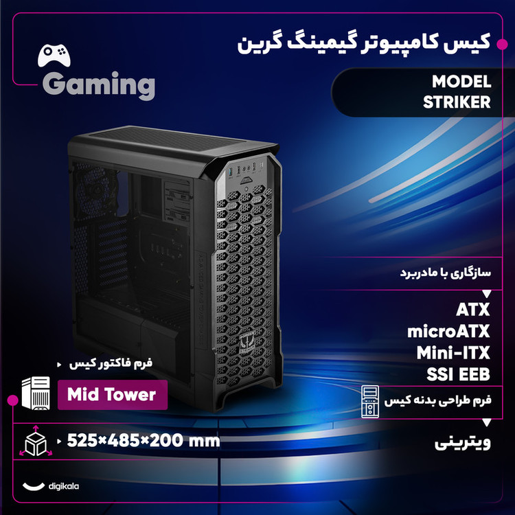کیس «Striker» محصولی حرفهای از شرکت «گرین» بوده که برای گیمرها طراحی و تولید شده است. این کیس طراحی کاملا حرفهای دارد و میتواند میزبانی مناسب برای قطعات کامپیوتر باشد. فرم اکتور این کیسMid Tower است و از کیسهایی با فرم فاکتور microATX، ATX، SSI CEB و Mini-ITX پشتیبانی میکند. در پنل جلویی این محصول یک درگاه USB3.0، یک درگاهUSB Type-C و دو درگاه USB2.0 به چشم میخورد که میتواند برای نصب سریع و آسان تجهیزاتی مانند فلشمموری و هارددیسک کاربردی باشد. ارتفاع جایگاه پردازنده در این محصول 157 میلیمتر و طول جایگاه قرارگیری کارت گرافیک در این محصول برابر با 390 میلیمتر است. این کیس به هشت جایگاه اسلات توسعه تجهیز شده است. شرکت گرین شش جایگاه فن در این کیس تعبیه کرده است که تعداد سه فن همراه با کیس ارائه میشود. این فنها از نوع 120 میلیمتری هستند و در پنل جلویی و پشتی نصب شدهاند. در قسمت کناری این کیس، یک پنجرهی شیشهای برای نظارت روی قطعات داخلی تعبیه شده است.